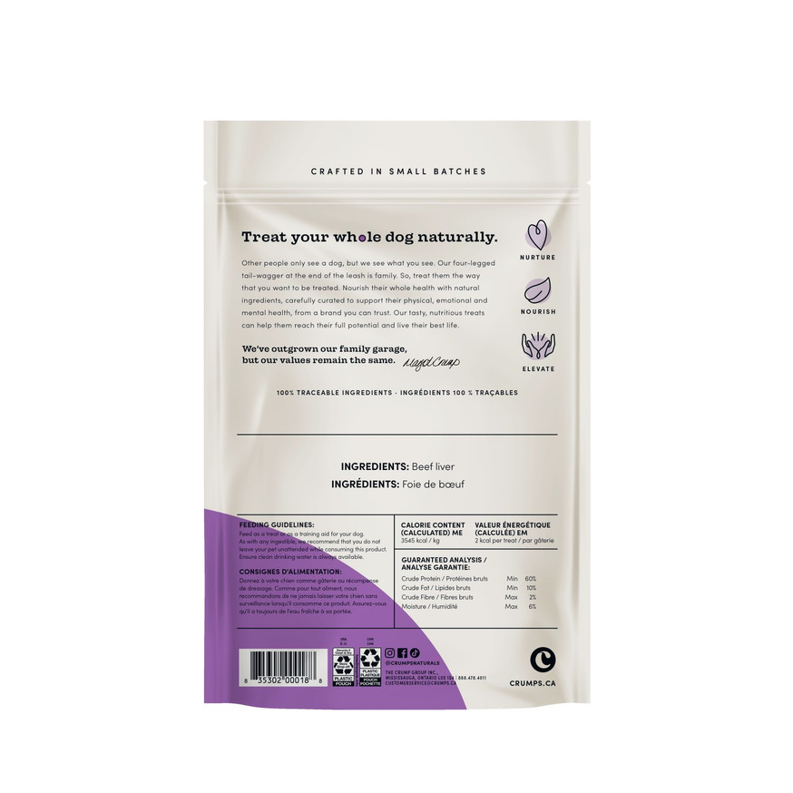 Crump' Naturals Beef Liver Bites are made from Canadian beef and freeze-dried to preserve their natural goodness and soft texture.