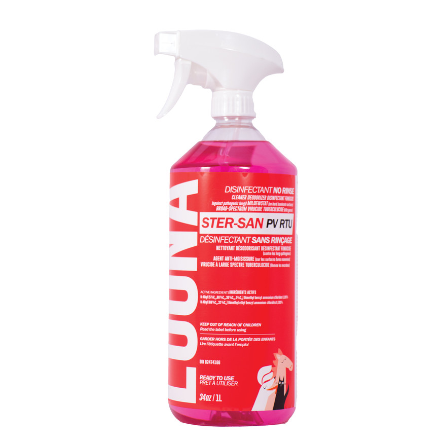 LOONA STER-SAN PV DISINFECTANT is a quaternary solution with a very pleasant smell, formulated as a freshener, virucidal, bactericidal, and fungicidal disinfectant. This solution is designed for places where disinfection is of prime importance to eliminate bacterial and viral infections transported by animals during their visit. Certified effective against parvovirus and kennel cough, LOONA STER-SAN PV DISINFECTANT is ideal for veterinary clinics, grooming salons, dog boarding, kennels, pet shops, stables, and breeders.