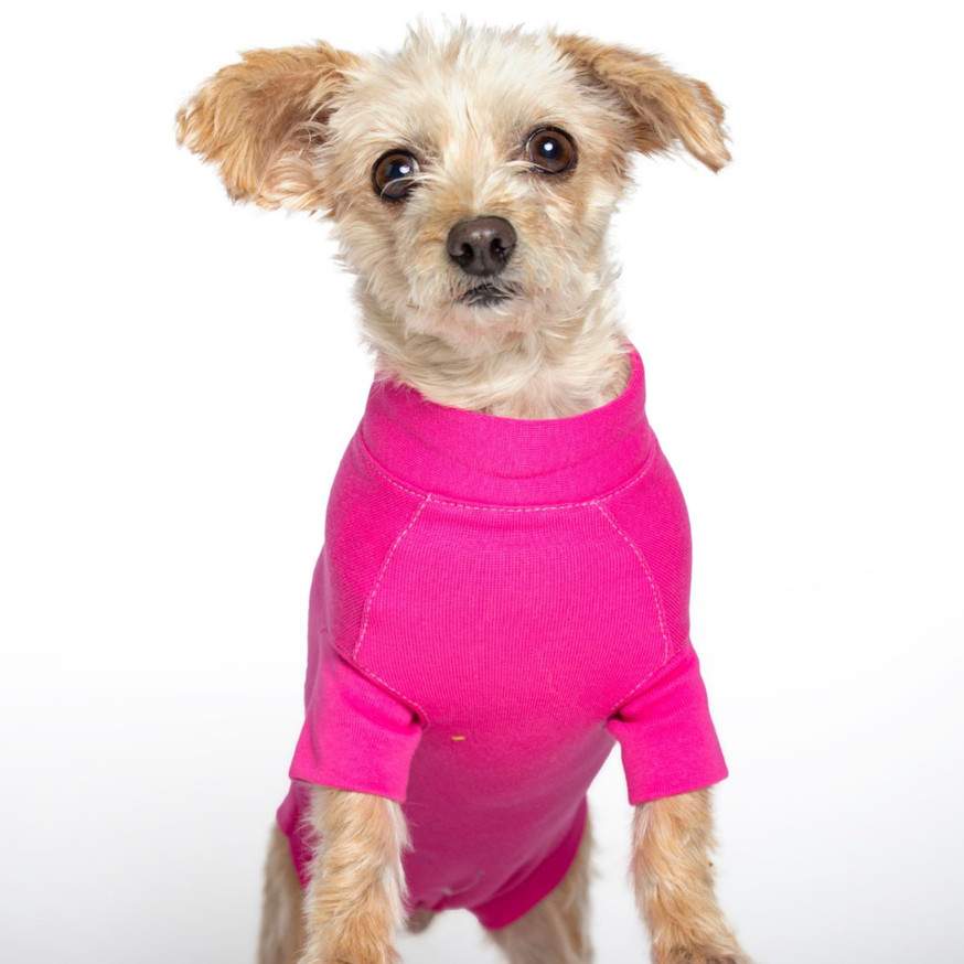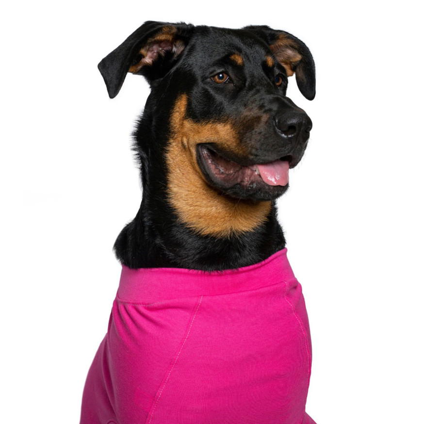 The suit's thoughtful design allows females to urinate through the back opening and male dogs through a dedicated urination hole—no adjustments or removal needed. Made from soft, breathable organic cotton to support comfortable recovery. Proudly made in Canada.
