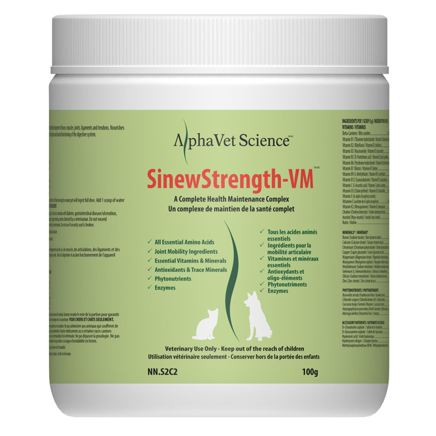 SinewStrength-VM™ is a comprehensive recovery complex designed to support your pet's overall health from the inside out. This powerful formula combines five of the most trusted joint care ingredients - D-chondroitin sulphate, D-glucosamine sulphate, MSM, hyaluronic acid, and hydrolyzed collagen - to promote healthy development and maintenance of bones, muscles, joints, ligaments, and tendons in both dogs and cats.